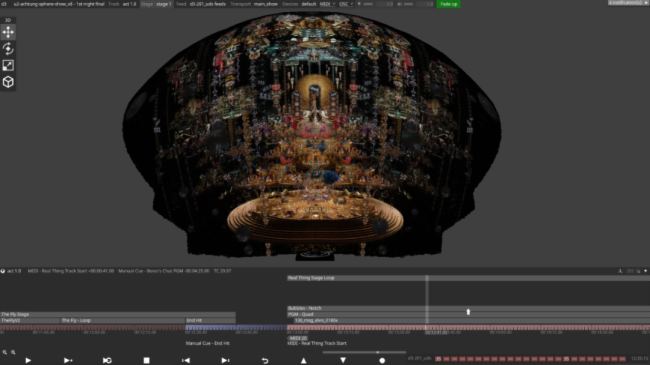 另外,我們創(chuàng)建了一個系統(tǒng),整合了大概 23 臺 gx 3 媒體服務器。這提供了所需的分辨率(我們主要運行 12K x 12K),同時也為我們提供了在巡回演出中習慣使用的所有攝像機集成和圖像處理功能。僅這一壯舉就足以獲得諾貝爾獎。