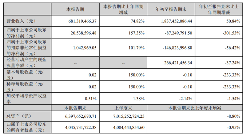 其中,第三季度實(shí)現(xiàn)營(yíng)業(yè)收入約6.81億元,同比增加74.82%;歸屬于上市公司股東的凈利潤(rùn)虧損約2054萬(wàn)元,同比增加157.35%;157.35%;歸屬于上市公司股東的扣除非經(jīng)常性損益的凈利潤(rùn)約104萬(wàn)元,同比增加101.79%。