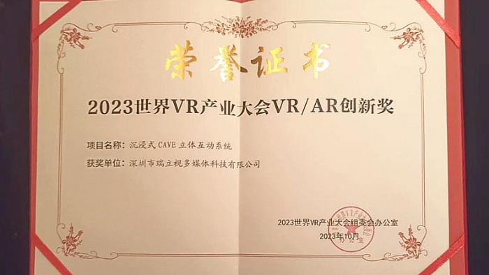 同時,在“2023世界VR產(chǎn)業(yè)大會VR/AR創(chuàng)新獎”評選中,瑞立視自主研發(fā)的沉浸式CAVE立體互動系統(tǒng)發(fā)揮自身創(chuàng)新優(yōu)勢,從眾多優(yōu)質(zhì)參評項目中脫穎而出,一舉斬獲“VR/AR創(chuàng)新獎”。