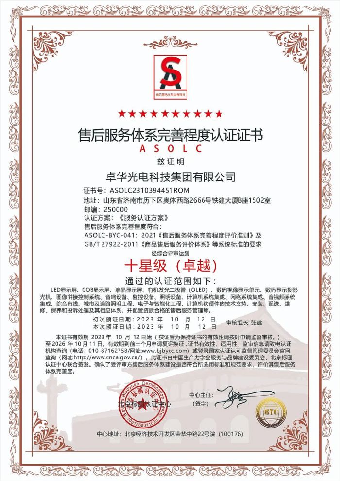 近日,卓華光電科技集團有限公司售后服務(wù)通過中國生產(chǎn)力學(xué)會服務(wù)與品牌建設(shè)委員會、北京標(biāo)圓認(rèn)證中心聯(lián)合認(rèn)證,榮獲十星級認(rèn)證證書。這一認(rèn)證的獲得,不僅僅是對Voury卓華售后服務(wù)成果的認(rèn)可,更是對Voury卓華致力于提供優(yōu)質(zhì)服務(wù)能力的肯定。