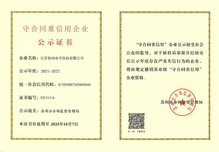 近日,蘇州市市場監(jiān)督管理局向社會公示了2021-2022年度蘇州市級“守合同重信用”企業(yè)名單,銀河電子憑借多年的規(guī)范管理和誠信經(jīng)營,已連續(xù)多年獲評蘇州市級“守合同重信用”企業(yè)。