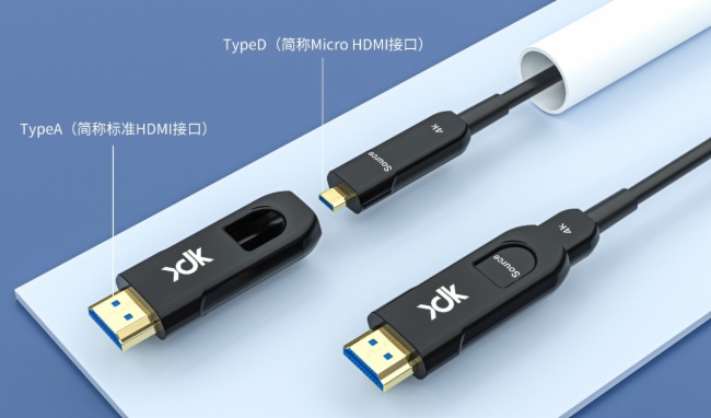 從用戶體驗(yàn)出發(fā),采用分體式可拆卸易穿管方案,光纖HDMI線穿管線還可化身為光纖Micro HDMI轉(zhuǎn)HDMI線和光纖HDMI線,分身有術(shù)靈活多用。其中光纖線的顯示端用一個(gè)轉(zhuǎn)接頭完成D轉(zhuǎn)A的功能,同時(shí)滿足TypeA和TypeD接口使用,另一端則采用標(biāo)準(zhǔn)的HDMI接口。我們的Micro HDMI外殼直徑僅13±0.1mm,可輕松穿過市面上幾乎所有管道(4分管的內(nèi)部直徑是15mm),使得布線施工變得更加簡(jiǎn)潔高效。