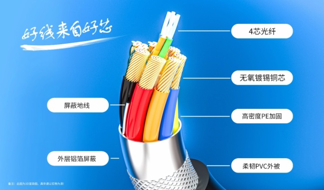 訊達(dá)康HDMI穿管光纖線真材實(shí)料無(wú)懼對(duì)比,內(nèi)部采用4芯優(yōu)質(zhì)光纖與多股無(wú)氧銅芯組合而成,具有耐壓、耐拉,滿足遠(yuǎn)距離裝修預(yù)埋需求。光纖傳輸具備無(wú)延遲、無(wú)衰減、無(wú)干擾、無(wú)輻射等優(yōu)點(diǎn)。線身的PVC外被柔軟適中,無(wú)懼彎折。全新銅芯采用的是混絞技術(shù),強(qiáng)韌抗拉扯,經(jīng)過多到彎折、對(duì)折、打結(jié),信號(hào)均無(wú)丟失,僅約4.5mm的線徑,相比傳統(tǒng)銅線更輕更細(xì)更快,占用空間小,穿管預(yù)埋布線更加方便,是工程家裝穿管布線性價(jià)比的不二之選。