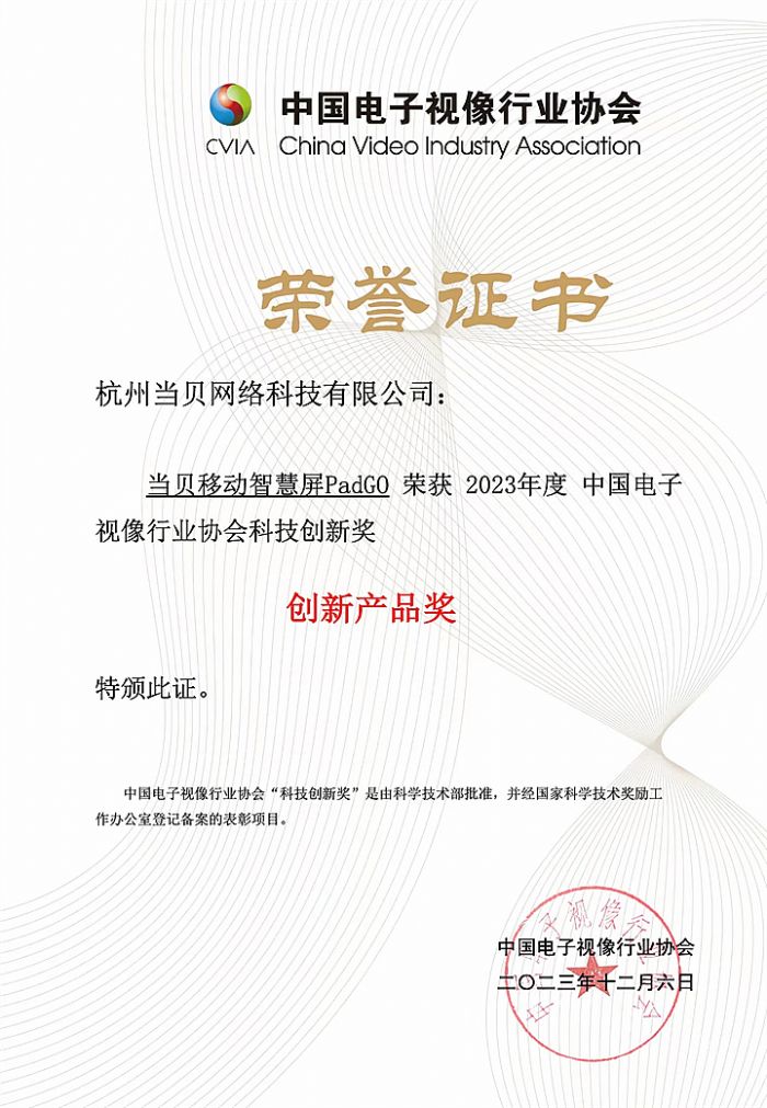 近日,第19屆中國音視頻產(chǎn)業(yè)大會在北京召開,大會頒發(fā)了全國性表彰項目“科技創(chuàng)新獎”,大屏領(lǐng)域知名品牌當(dāng)貝旗下“當(dāng)貝移動智慧屏PadGO”、“當(dāng)貝UI用戶界面”分別獲“創(chuàng)新產(chǎn)品獎”、“創(chuàng)新應(yīng)用獎”。