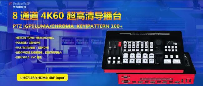 中帝威4K級(jí)導(dǎo)播切換臺(tái)UHS7108,視頻信號(hào)接口支持4路HDMI+4路DP共8路視頻輸入,3路HDMI輸出。音頻信號(hào)接口支持2路話筒輸入,1路LINE輸入,1路Line 輸出。