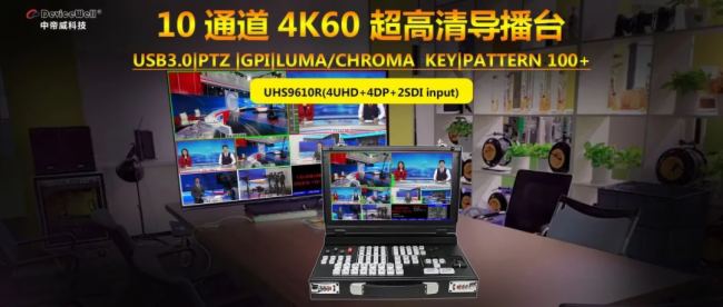 中帝威4K級(jí)導(dǎo)播切換臺(tái)UHS9610R,視頻信號(hào)接口支持2路SDI+4路HDMI-compatible +4路DP共10路視頻輸入,2路SDI輸出+6路HDMI-compatible輸出+1路UVC輸出,共9路視頻信號(hào)輸出。