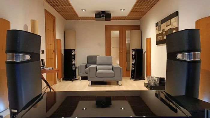 案例中的影院空間并不大,但也不影響兼容Hifi和影院一起。全套Focal外擺系統(tǒng)搭配SIM2 Crystal4 sh投影機(jī),HIFI模式下只需收起電動(dòng)幕布,就不影響前墻的擴(kuò)散材料。采用大落地箱做后環(huán)繞的動(dòng)態(tài),速度和聲音密度和細(xì)節(jié)確實(shí)會(huì)讓影院包圍感更強(qiáng)烈!