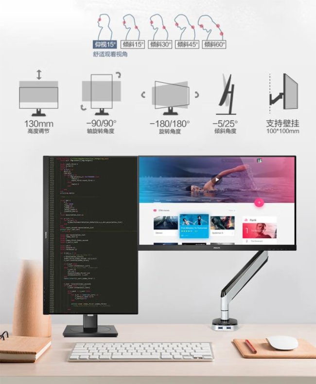 區(qū)別于傳統(tǒng)顯示器的固定底座,飛利浦人體工學(xué)底座可以實(shí)現(xiàn)大幅度的高度、角度靈活調(diào)節(jié),支持上下、左右、俯仰、旋轉(zhuǎn)等方向的自由設(shè)置,幫助大家在有限的空間內(nèi)找到更加舒適的坐姿與觀看角度,減輕長時間工作產(chǎn)生的身體疲勞。