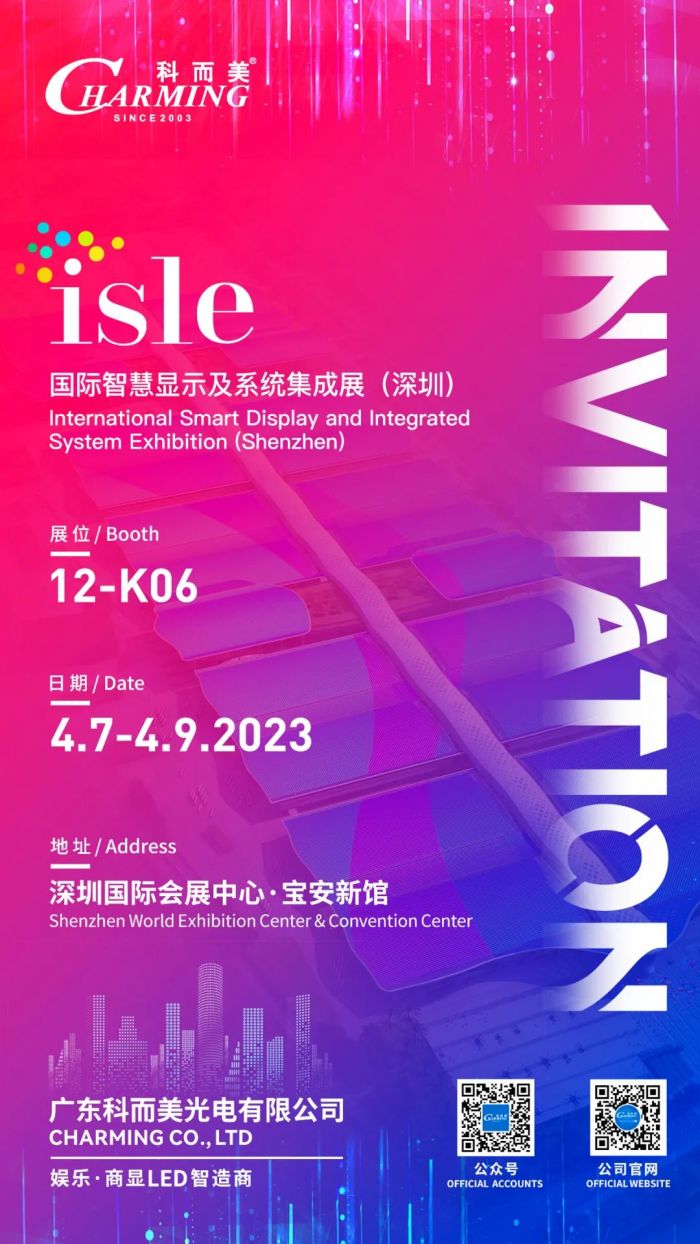 深圳國(guó)際智慧顯示及系統(tǒng)集成展(“ISLE展”)將于2023年4月7-9日在深圳國(guó)際會(huì)展中心(寶安新館)9-12號(hào)館舉辦,科而美歡迎海內(nèi)外客戶蒞臨現(xiàn)場(chǎng)參觀交流。