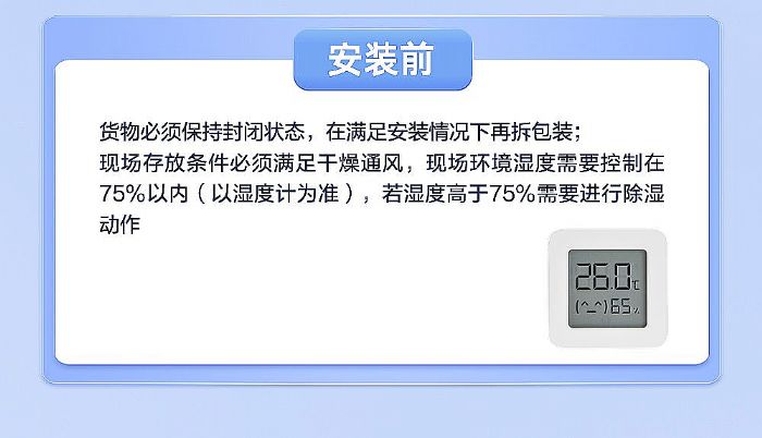 現(xiàn)場存放條件必須滿足干燥通風(fēng),現(xiàn)場環(huán)境濕度需要控制在75%以內(nèi)(以濕度計為準(zhǔn)),若濕度高于75%需要進(jìn)行除濕動作。