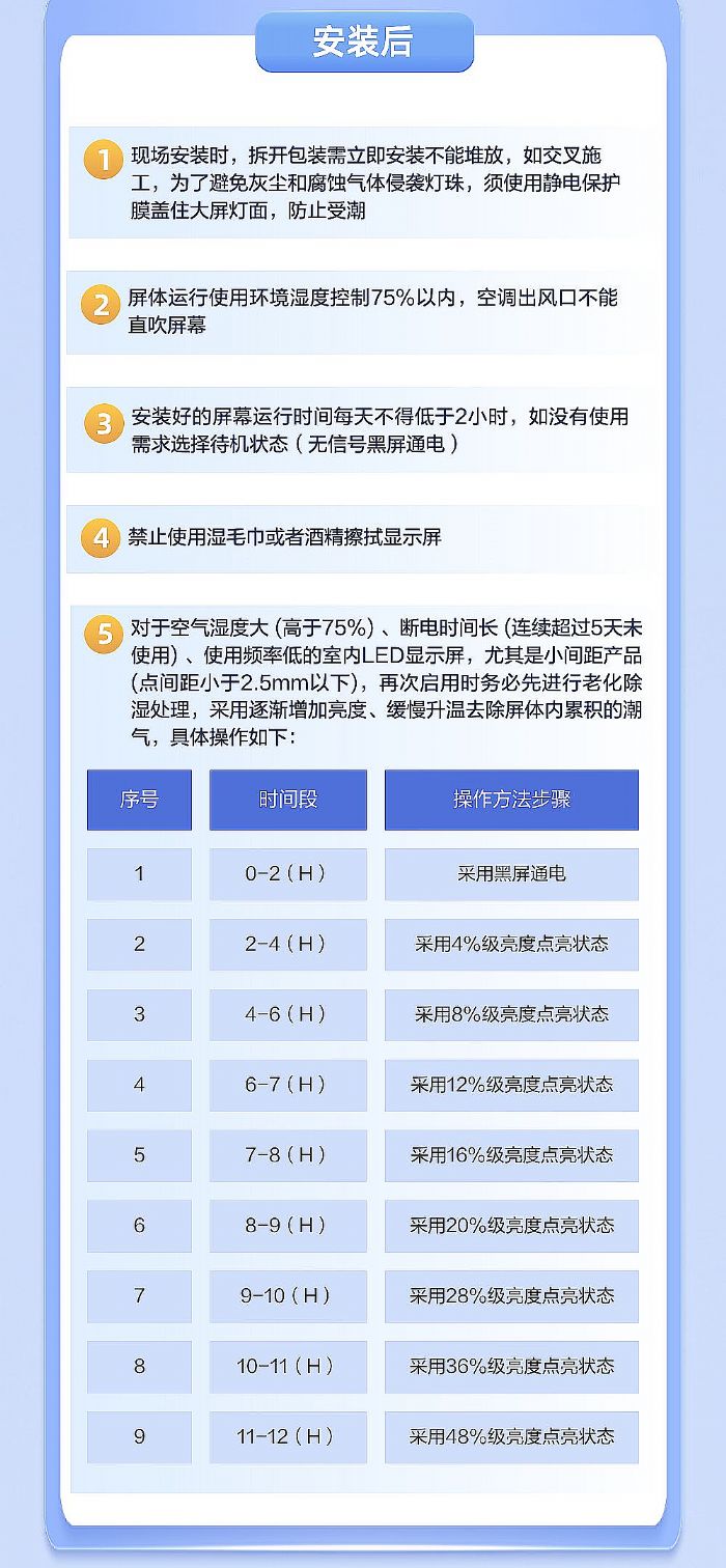 5對于空氣濕度大(高于75%)、斷電時間長(連續(xù)超過5天未使用)、使用頻率低的室內(nèi)LED顯示屏,尤其是小間距產(chǎn)品(點間距小于2.5mm以下),再次啟用時務(wù)必先進(jìn)行老化除濕處理,采用逐漸增加亮度、緩慢升溫去除屏體內(nèi)累積的潮氣