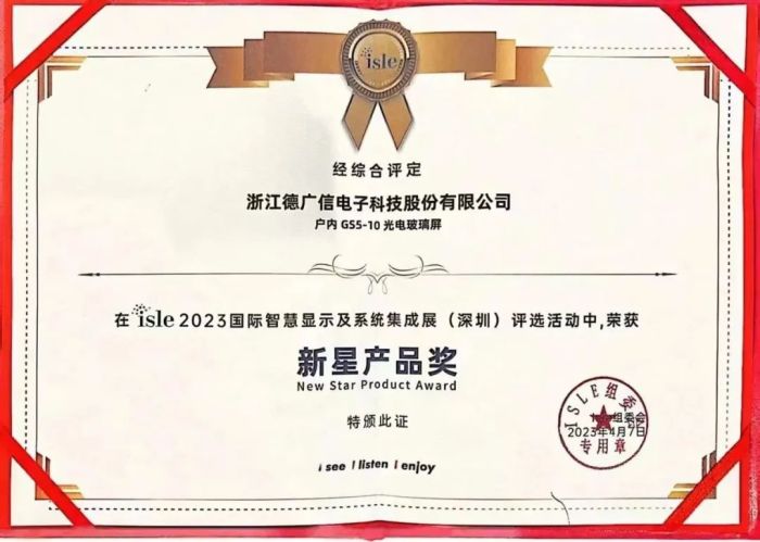 展覽現場火爆,德廣信GS光電玻璃憑借其出色的顯示效果、創(chuàng)新能力獲得行業(yè)內各專家的認可,在isle2023國際智慧顯示及系統集成展 (深圳)評選活動中,榮獲優(yōu)秀產品獎、新星產品獎兩項大獎。