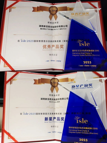 2023深圳國際智慧顯示及系統(tǒng)集成展(以下簡稱ISLE 2023)正在如火如荼進(jìn)行中。4月7日晚,在ISLE 2023晚宴暨頒獎典禮上,新亞勝光電憑借高質(zhì)量的顯示屏產(chǎn)品及豐富的場景應(yīng)用方案,MG7S-T系列和MG7S Cube系列分別獲得“優(yōu)秀產(chǎn)品獎”及“新星產(chǎn)品獎”。