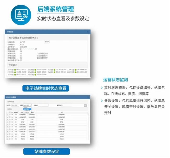 ?低曤娮庸徽九茖I(yè)適配戶外環(huán)境,自動溫度保護,防水、防塵,穩(wěn)定性強 。在后端系統(tǒng)中,可實時進行參數(shù)設(shè)定,查看電子站牌狀態(tài), 運維管理高效又便捷。