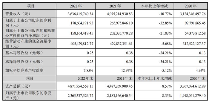 20223年4月26日,鴻利智匯發(fā)布2022年年度報(bào)告。報(bào)告期內(nèi),公司實(shí)現(xiàn)營業(yè)收入 363,641.57 萬元,同比下降 10.77%;實(shí)現(xiàn)利潤總額 20,759.85 萬元,同比下降 18.00%;歸屬于母公司所有者凈利潤 17,860.42 萬元,同比下降 32.85%。