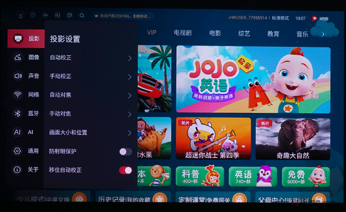 針對(duì)投影的使用場(chǎng)景,Vidda在JUUI原系統(tǒng)的基礎(chǔ)之上進(jìn)行了定制化處理,操控菜單內(nèi)加入了針對(duì)投影所需的各類(lèi)設(shè)置選項(xiàng),例如針對(duì)投影設(shè)置的梯形校正、對(duì)焦、畫(huà)面調(diào)整等,針對(duì)畫(huà)面設(shè)定所設(shè)置的圖像菜單等。