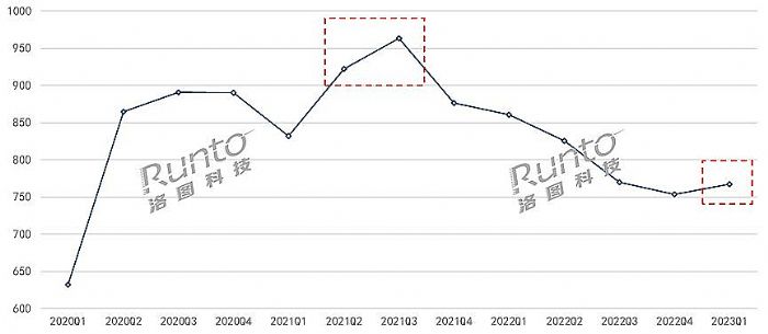 隨后,由于細(xì)分市場較低的進(jìn)入門檻和廣闊的發(fā)展前景,更多的中小品牌開始涌入1LCD投影賽道,通過直給低價(jià),快速分一杯羹。市場均價(jià)迅速進(jìn)入下行通道,到2022年第四季度低至753元。