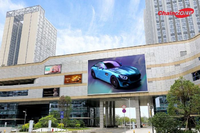 在中盈盛達(dá)國(guó)際金融中心的廣場(chǎng)外部,284平方米的EXL系列戶(hù)外顯示大屏炫酷點(diǎn)亮。