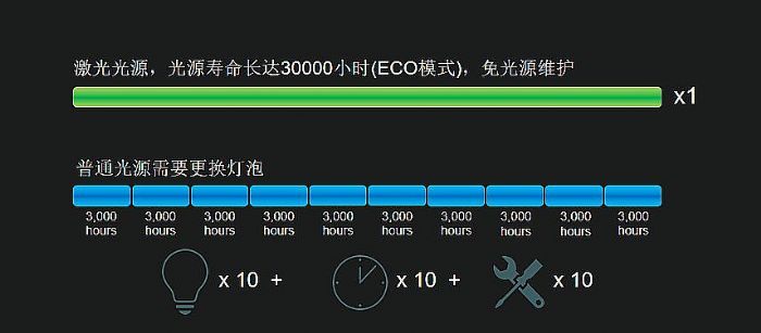 激光光源穩(wěn)定持久,是一般投影機(jī)燈泡壽命的6~10倍,基本不需要更換光源,因此可以安心使用。