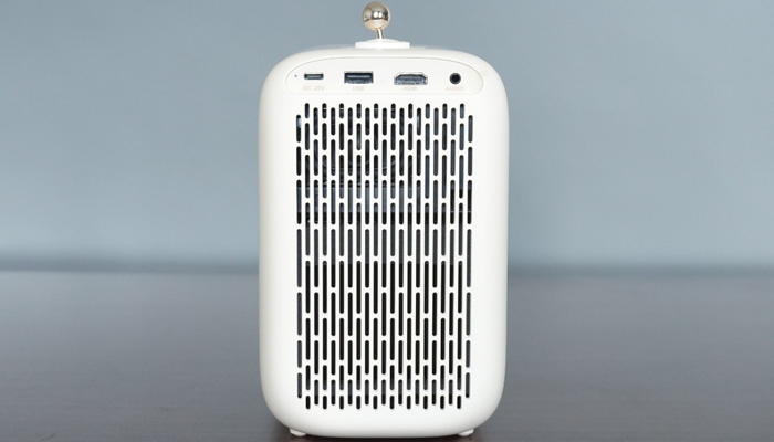 在機(jī)身的后側(cè),哈趣H2投影儀不僅設(shè)計(jì)有HDMI接口、USB接口、電源接口,還有大面積的散熱設(shè)計(jì),接駁各種設(shè)備都可以藏于機(jī)身后面,而且散熱聲也非常小,不影響觀影體驗(yàn)。