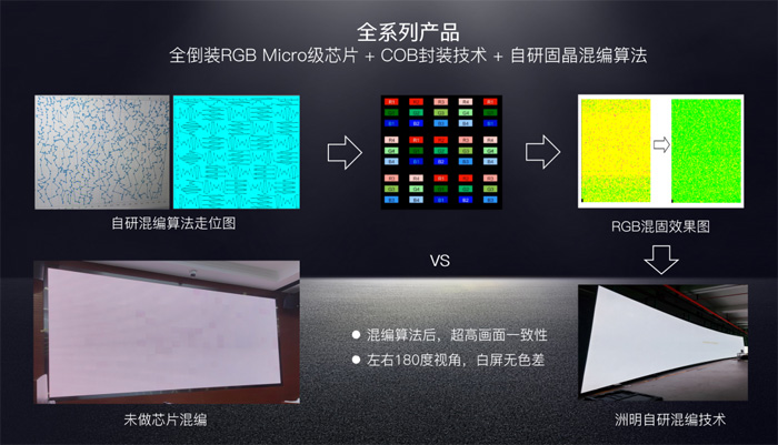 全系列產(chǎn)品采用“全倒裝RGB Micro級芯片+COB封裝技術(shù)”,徹底解決因焊線因素導(dǎo)致的失效,并極大降低金屬遷移造成的失效風(fēng)險,無SMD焊盤裸露,失效率降低50%。此外,洲明自研的固晶混編算法,在提升產(chǎn)品一致性、均勻性的同時,也能保證固晶效率。