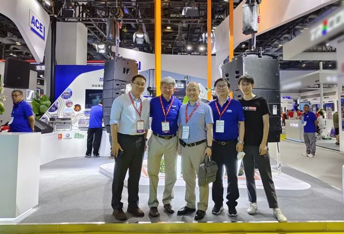 哈曼專業(yè)音視系統(tǒng)事業(yè)部副總裁及大中華區(qū)總經(jīng)理 Tim Yeung(楊天元)先生,哈曼專業(yè)音視系統(tǒng)事業(yè)部固定安裝高級銷售經(jīng)理 嚴利梁先生與哈曼(中國)投資有限公司技術銷售經(jīng)理 胡煒果先生,蒞臨ACE展位,并與安恒利總裁 Terry Lo(盧志強)先生及安恒利工程/演藝/演出事業(yè)部總經(jīng)理 劉濤先生親切交談,合影留念。