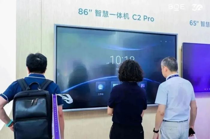 BOE智慧一體機系列產(chǎn)品U1 和C2Pro,采用超窄邊框和超高清顯示屏,為用戶提供極致視覺體驗,并搭載全新的京東方自研系統(tǒng),采用自研AI技術(shù)與軟件產(chǎn)品,為辦公、教學、金融、醫(yī)療等終端場景提供智慧的協(xié)作平臺,能夠滿足客戶不同場景需求。