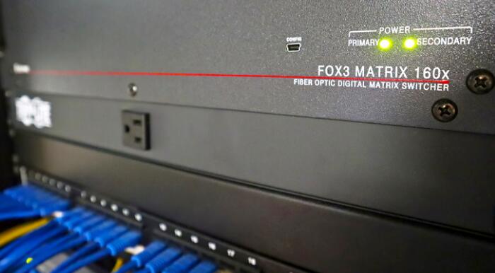 FOX3 Matrix 160x 當(dāng)前配置為 104x104,其通過多模光纜架構(gòu)為整個中心提供 4K/60 HDMI 視頻、音頻、USB 和控制信號的切換及分配。輸入/輸出板卡支持 4:4:4 色度取樣,可確保為不同顯示設(shè)備提供最佳的圖像品質(zhì)。必要時,支持團(tuán)隊還可通過光纜啟動 3D 同步。機(jī)箱剩余的插槽可預(yù)留給未來系統(tǒng)擴(kuò)展。