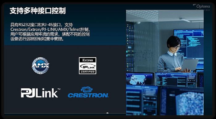 除此之外,投影儀一些特色的功能配置往往也是加分項,可以滿足一些特定的應用,尤其是商用投影會配備比較齊全的接口,例如奧圖碼EL520H除了2個主流的HDMI1.4b接口,還配備了1個RJ45網(wǎng)絡接口、1個RS232控制接口和一個音頻輸出接口,可兼容更多新老設備,并能直聯(lián)音響設備。