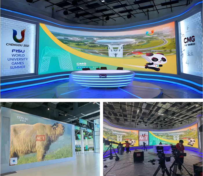 AET阿爾泰攜手芯映光電,以技術(shù)力量助力國(guó)際廣播中心融媒體中心及中央廣播電視總臺(tái)奧林匹克頻道直播演播區(qū)等大屏制作項(xiàng)目,使用微間距Mini LED級(jí)別產(chǎn)品——XF-CMB09N4-B(p0.9)特別打造超大尺寸、8K超高清、超強(qiáng)沉浸直播演播大屏,將顯示與體育完美融合,生動(dòng)呈現(xiàn)著每一個(gè)激烈的瞬間,讓觀眾置身于精彩絕倫的運(yùn)動(dòng)盛宴中,近距離感受運(yùn)動(dòng)員的激情和技藝,向世界呈現(xiàn)“大運(yùn)”精彩!