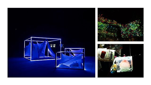 本次展覽一共選取中傳核桃林與古樹林兩處校園場所為展覽空間,師生團(tuán)隊(duì)開展了為期一個(gè)學(xué)期的策劃、設(shè)計(jì)與制作實(shí)施工作。在共同努力創(chuàng)作下,本次展覽一共展出超過十件作品,中包括光裝置、環(huán)境戲劇、多媒體裝置、光影雕刻藝術(shù)等形式,展示了師生團(tuán)隊(duì)在光影藝術(shù)教育中的豐碩成果。本次展覽吸引了大批校內(nèi)外觀眾和業(yè)內(nèi)專業(yè)人士,為他們提供了深入了解和欣賞中國傳媒大學(xué)光影空間藝術(shù)專業(yè)學(xué)生成果的難得機(jī)會(huì)。