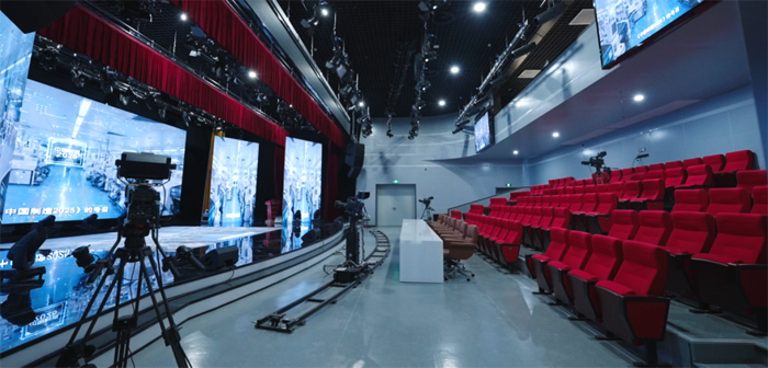在融媒體中心大舞臺(tái)上,可以看到由AOC LED顯示屏所組成的舞臺(tái)背景墻。背景墻根據(jù)實(shí)際空間布局,采用多面拼接的方式展示,更有助于發(fā)揮“返送屏”的作用,將舞臺(tái)現(xiàn)場(chǎng)畫(huà)面高清化、細(xì)膩化展示,實(shí)現(xiàn)內(nèi)容精準(zhǔn)呈現(xiàn)。同時(shí)也能充分適應(yīng)演播現(xiàn)場(chǎng)不同環(huán)境亮度,畫(huà)面表現(xiàn)力更佳。