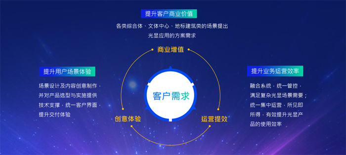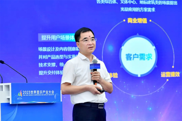 袁道仁指出,LED技術(shù)與體驗經(jīng)濟的融合發(fā)展,為光顯行業(yè)帶來巨大發(fā)展機遇。而光顯融合的場景應(yīng)用能夠滿足客戶潛在的、真正的需求,即“商業(yè)增值、創(chuàng)意體驗、運營增效”。