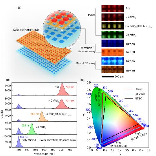研究團隊利用玻璃微孔陣列,將雙組分鈣鈦礦量子點應用于藍光Micro LED色轉換層中,從而實現(xiàn)紅藍光發(fā)光強度和穩(wěn)定性的提升。這項研究從性能提升、工藝精簡方面“雙管齊下”,突破當前Micro LED紅光色轉換技術瓶頸,以更低成本實現(xiàn)了高質量Micro-LED全彩顯示效果,推動了我國Micro LED全彩顯示技術的產業(yè)化發(fā)展。