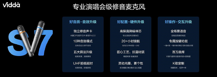 音質(zhì)方面,NEW X搭載了V-Sound2.0高保真音響系統(tǒng),在保證硬件性能基礎(chǔ)上,豐富線上內(nèi)容,優(yōu)化全鏈路聲音調(diào)教算法,并且經(jīng)過了海信金耳朵團(tuán)隊(duì)的層層把關(guān)和音質(zhì)調(diào)教。同時(shí)在85英寸機(jī)型上,沿用了2.1聲道配置,搭載獨(dú)立低音炮,讓低音更渾厚有力。NEW X還搭載了Vidda音樂生態(tài),內(nèi)置千萬級音樂曲庫和海量K歌曲庫,搭配Vidda麥克風(fēng),客廳一秒變身KTV包房。作為音樂生態(tài)的最新成員,本次Vidda還發(fā)布了自研修音麥克風(fēng)新品S7,讓所有人都可以享受歌唱的樂趣。