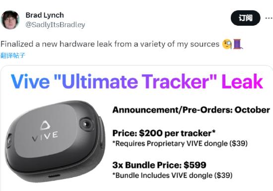 據(jù)硬件分析師 Brad Lynch 稱,該配件將以 Vive Ultimate Tracker 的名義推出,每個追蹤器的價格為 200 美元。專有的 USB-C 加密狗另外花費 39 美元。如果用戶捆綁購買三個智能設(shè)備,則可以免費獲得 USB-C 加密狗。