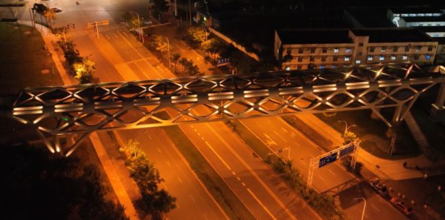 高新二路跨線橋的橋梁主體為四邊形的網(wǎng)狀結(jié)構(gòu)。恩倍思在網(wǎng)狀結(jié)構(gòu)的每一個交叉點(diǎn)設(shè)置LED投光燈,光束由結(jié)點(diǎn)向外發(fā)散,漸變的燈光效果營造出夢幻的意境。當(dāng)空軌列車經(jīng)過時,燈光隨之流動起來,或明或暗,一深一淺,如同空中流云被暈染成各樣的顏色,光影變化,輕盈飄逸。