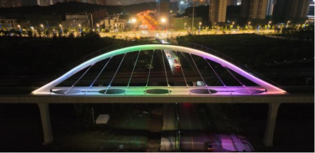 神墩三路跨線橋的整體造型結(jié)構(gòu)形似古琴,大橋拱肋上設(shè)LED洗墻燈以勾勒古琴輪廓,斜拉索如根根琴弦,用LED投光燈投射每根琴弦,光影變幻下顯得輕靈而韻動。點(diǎn)亮的古琴架于神墩三路之上,用光的語言演奏出光谷片區(qū)溝通與發(fā)展的樂章。