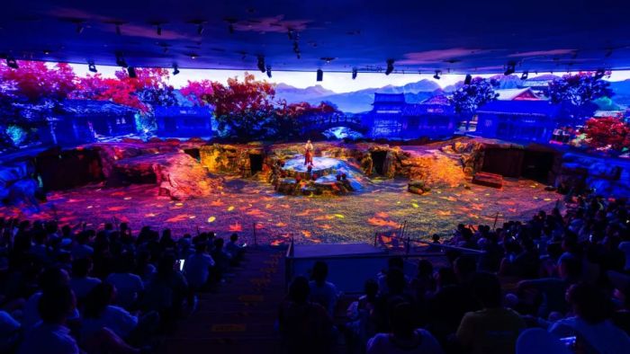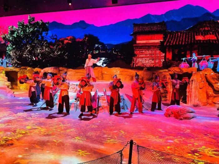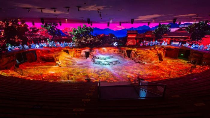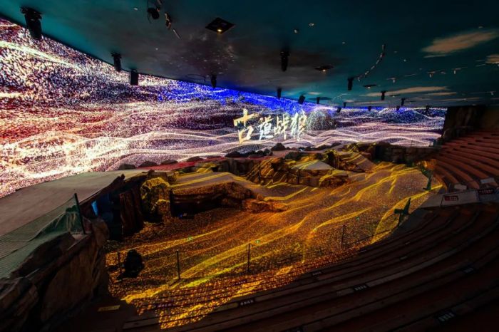 《古道戰(zhàn)狼》于2023年推出,是國內(nèi)外獨(dú)具特色的人狼同臺演出。演出以絲路古道上駝工不畏兇險(xiǎn)、與死亡大漠進(jìn)行生死挑戰(zhàn)為主題,融合投影、聲光電等數(shù)字技術(shù),將科技呈現(xiàn)與實(shí)景演藝完美結(jié)合,創(chuàng)新地把古道絲路中人狼大戰(zhàn)搬上舞臺,挖掘出千百年前被風(fēng)沙掩沒的歷史。