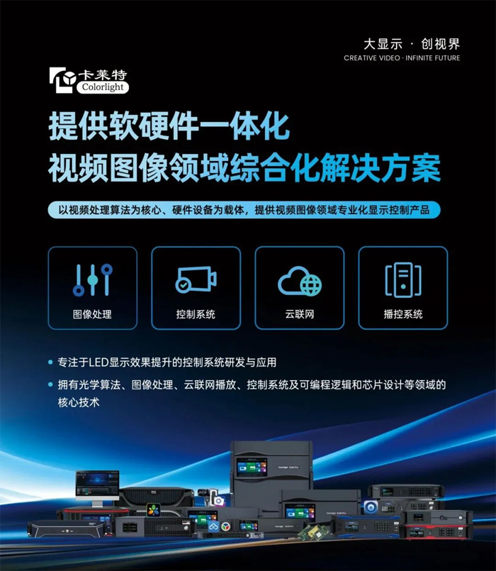 卡萊特始終響應(yīng)國家重點(diǎn)戰(zhàn)略需要和應(yīng)用需求,深耕圖像領(lǐng)域顯示技術(shù)創(chuàng)新、賦能業(yè)務(wù)發(fā)展,努力做到“人無我有、人有我優(yōu)”,持續(xù)在技術(shù)、服務(wù)、產(chǎn)品、解決方案上全方位創(chuàng)新,形成LED控制系統(tǒng)、視頻處理設(shè)備及云聯(lián)網(wǎng)播放器組成的強(qiáng)大產(chǎn)品矩陣,開創(chuàng)性提出5G+8K超高清、XR虛擬拍攝、創(chuàng)意顯示、3D顯示等先進(jìn)專業(yè)的LED顯示控制解決方案。