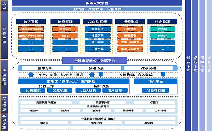 應用支撐層包括寧波市一體化智能化公共數(shù)據(jù)平臺以及鄞州區(qū)“數(shù)字人大”平臺的用戶體系對接、市人大平臺的AI標簽對接;
