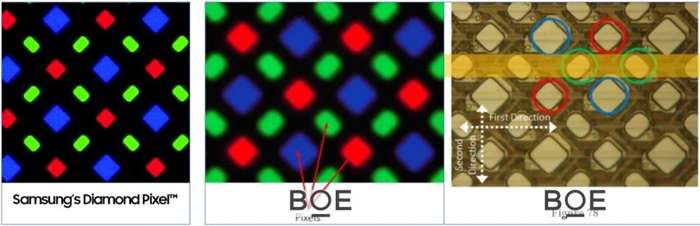 三星顯示器聲稱,京東方的RGB OLED子像素陣列結(jié)構(gòu)和它的鉆石像素陣列結(jié)構(gòu)類似,該結(jié)構(gòu)在去年向美國(guó)德克薩斯州東區(qū)地方法院提交的訴狀中作為專利侵權(quán)證據(jù)。