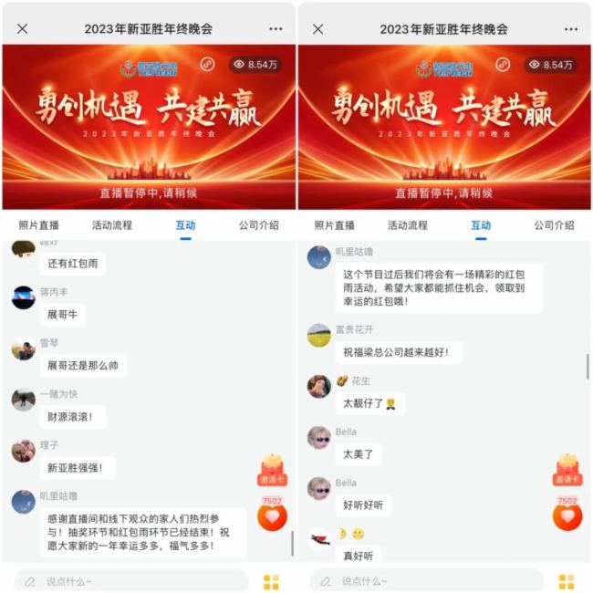 在新亞勝的家人們的歡聲笑語中,2023年新亞勝光電年終晚會圓滿完成。線上直播間瀏覽量超過8萬次,感謝各位觀眾對新亞勝光電年終晚會的支持!
