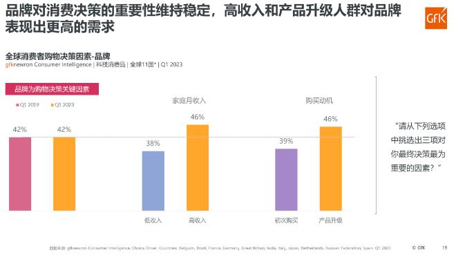 此外,gfknewron Consumer 2023年Q1的一項(xiàng)全球消費(fèi)者購物決策因素調(diào)查數(shù)據(jù)顯示,在高收入人群和以替換升級為購買動機(jī)的人群中,將品牌列入購物最終決策因素前三名的占比明顯較高,說明在高端市場,品牌建設(shè)的重要性尤其不可小覷。