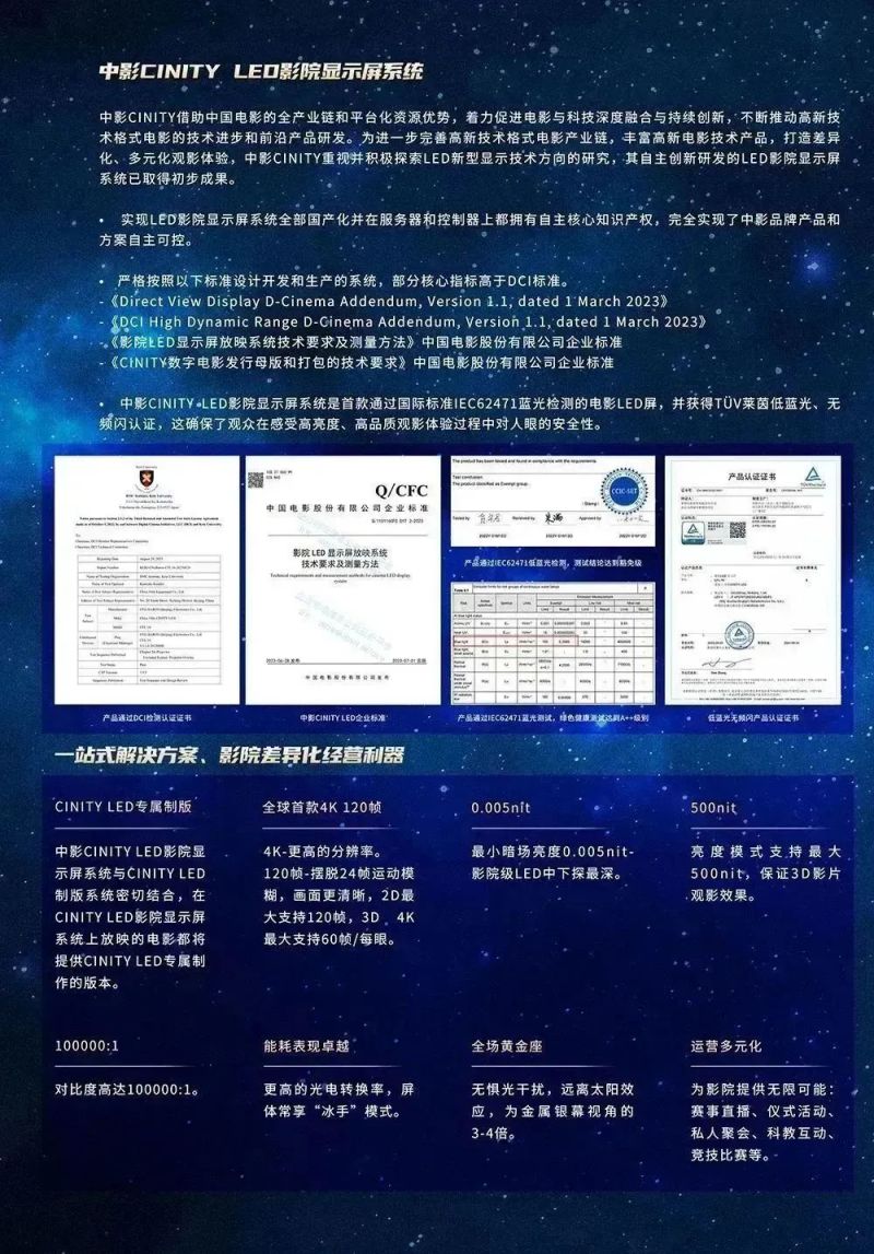 中影CINITY LED影院顯示屏系統(tǒng)是首款通過(guò)國(guó)際標(biāo)準(zhǔn)IEC62471藍(lán)光檢測(cè)的電影LED屏,并獲得TÜV萊茵低藍(lán)光、無(wú)頻閃認(rèn)證,這確保了觀眾在感受高亮度、高品質(zhì)觀影體驗(yàn)過(guò)程中對(duì)人眼的安全性。