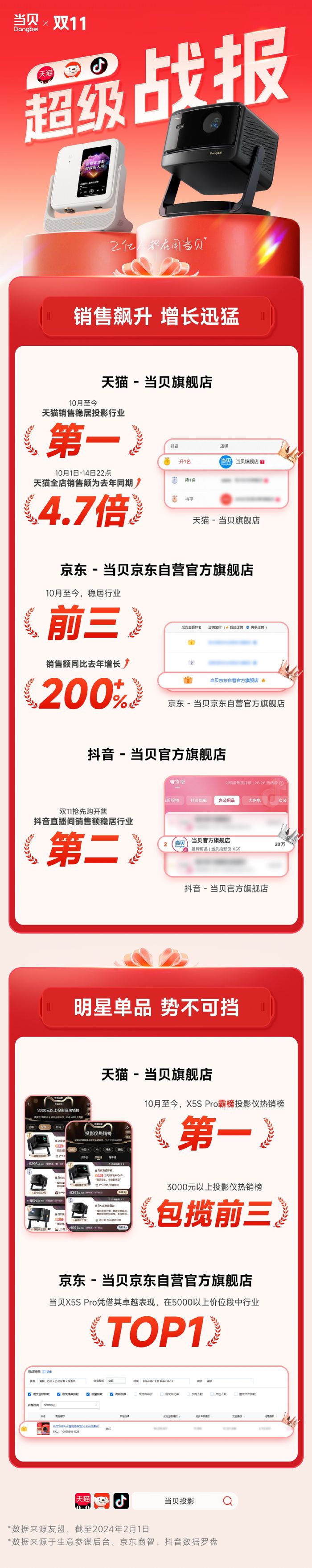 在這張成績(jī)單中,在天貓平臺(tái)上,當(dāng)貝旗艦店穩(wěn)居投影行業(yè)銷(xiāo)售第一,全店銷(xiāo)售額較去年同期增長(zhǎng)了4.7倍,展現(xiàn)出強(qiáng)大的市場(chǎng)競(jìng)爭(zhēng)力。明星單品X5S Pro自10月份以來(lái)一直霸榜投影儀熱銷(xiāo)榜第一,3000元以上投影儀熱銷(xiāo)榜更是包攬前三,充分證明了當(dāng)貝品牌在投影儀市場(chǎng)的領(lǐng)先地位。京東平臺(tái)上,當(dāng)貝京東自營(yíng)官方旗艦店銷(xiāo)售額同比去年增長(zhǎng)了200%,排名前列。其中,當(dāng)貝X5S Pro憑借其卓越表現(xiàn),在5000元以上價(jià)位段中穩(wěn)居行業(yè)TOP1,進(jìn)一步鞏固了當(dāng)貝品牌在高端投影儀市場(chǎng)的地位。抖音平臺(tái)上,當(dāng)貝官方旗艦店直播間銷(xiāo)售穩(wěn)居行業(yè)第二,同樣表現(xiàn)出色?偨Y(jié)起來(lái)說(shuō),當(dāng)貝這次的雙十一開(kāi)門(mén)紅可謂是贏得了滿(mǎn)堂彩。