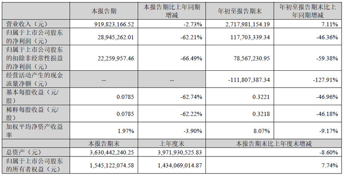 第三季度實(shí)現(xiàn)營(yíng)收1.12億元,同減14.98%;歸母凈利潤(rùn)679萬元,扣非凈利潤(rùn)31.22萬元,同比下降94.17%。