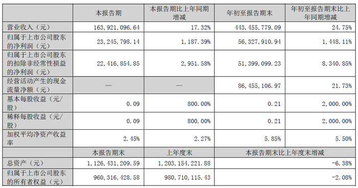 江蘇日久光電股份有限公司前三季度實(shí)現(xiàn)營(yíng)業(yè)收入4.43億元,同增24.75%;歸母凈利潤(rùn)5632.79萬元,同增1448.11%;扣非凈利潤(rùn)5139.91萬元,同增8340.85%。其中,第三季度實(shí)現(xiàn)營(yíng)業(yè)收入1.64億元,同增17.32%;歸母凈利潤(rùn)2324.58萬元,同增1187.39%;扣非凈利潤(rùn)2241.69萬元,同增2951.58%。