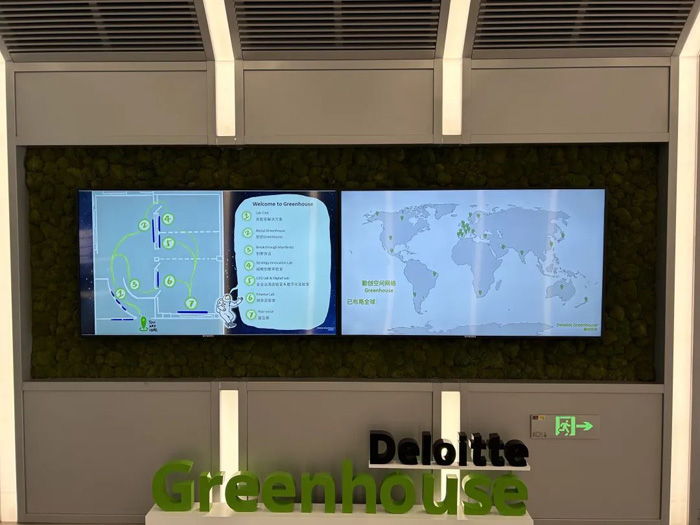 走進德勤書院,映入眼簾的“智慧樹”吸引了大家的目光,它不僅是創(chuàng)維為德勤定制的一款樹木形狀的5條LED屏幕,體現(xiàn)了德勤的‘4+1’ 文化,更是一件融合了現(xiàn)代科技與藝術(shù)設計和環(huán)?沙掷m(xù)發(fā)展的創(chuàng)新之作!爸腔蹣洹逼聊簧蠒シ艢g迎詞,天氣預報、市值股指行情、辦學初衷等信息。