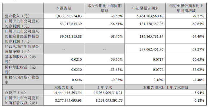 其中,第三季度營收約18.33億元,同比減少8.56%;歸母凈利潤約5321.26萬元,同比減少56.61%;扣非凈利潤3903.28萬元,同比減少68.40%。報告期末,總資產(chǎn)144.44億元,本報告期末比上年度末減少3.94%。